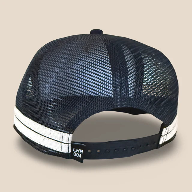 Black foam front and Back mesh back and brim. Natural unbleached cotton stripes on the side.Â